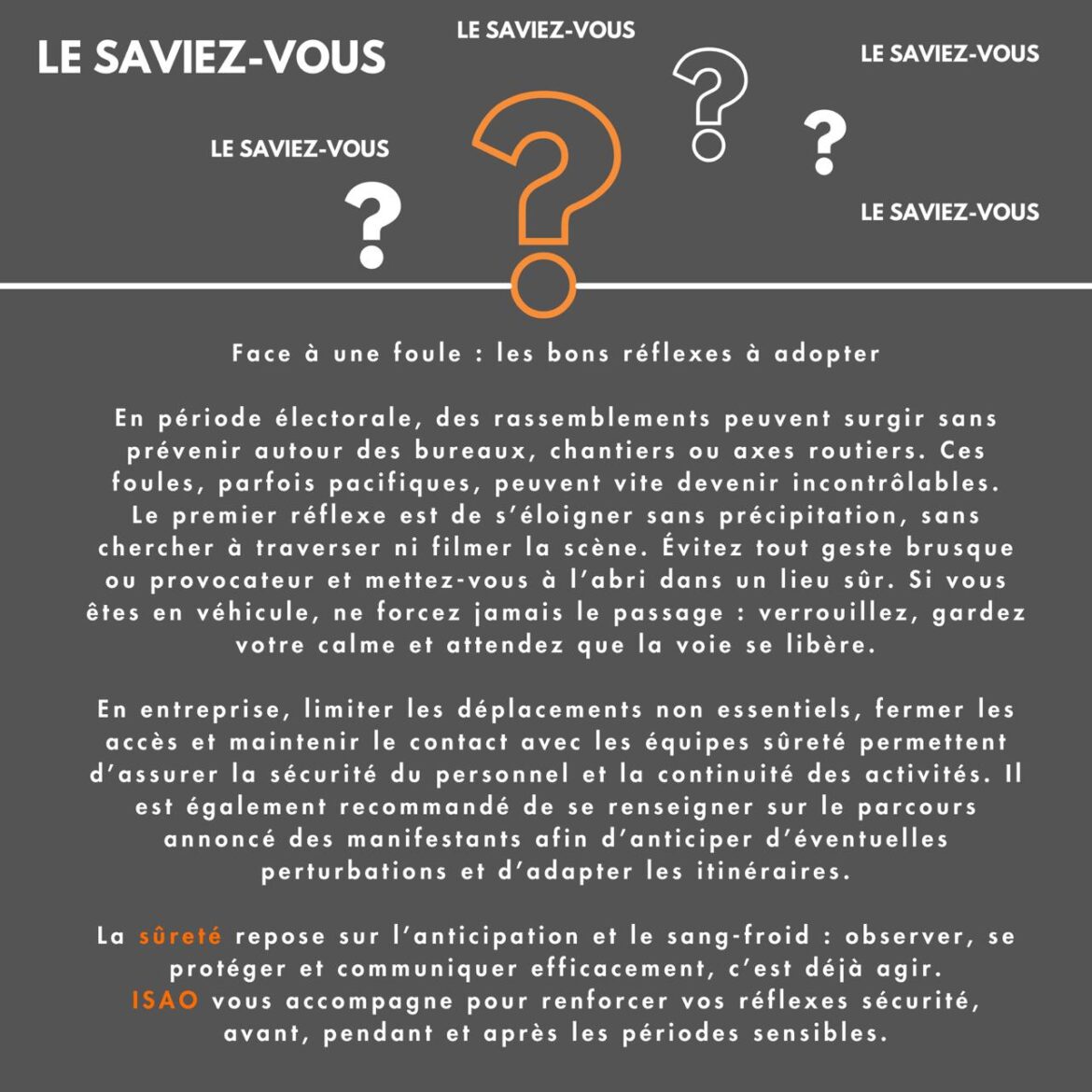 Face à une foule : les bons réflexes à adopter En période électorale, des rassemblements peuvent surgir sans prévenir autour des bureaux, chantiers ou axes routiers. Ces foules, parfois pacifiques, peuvent vite devenir incontrôlables.Le premier réflexe est de s’éloigner sans précipitation, sans chercher à traverser ni filmer la scène. Évitez tout geste brusque ou provocateur